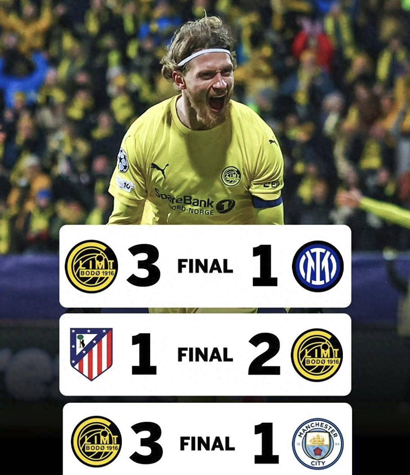 จากการที่อินเตอร์ มิลาน พ่ายแพ้อย่างน่าตกใจ 1-3 และแอตเลติโก มาดริด เสมอ 3-3 ทำให้ชัยชนะ 1-0 ของเรอัล มาดริด ทำให้ทีมที่ผ่านเข้ารอบเพลย์ออฟแชมเปียนส์ลีกทั้งแปดทีมได้รับการยืนยันแล้ว: โบโด/กลิมท์ (เยือน); โอลิมเปียกอส