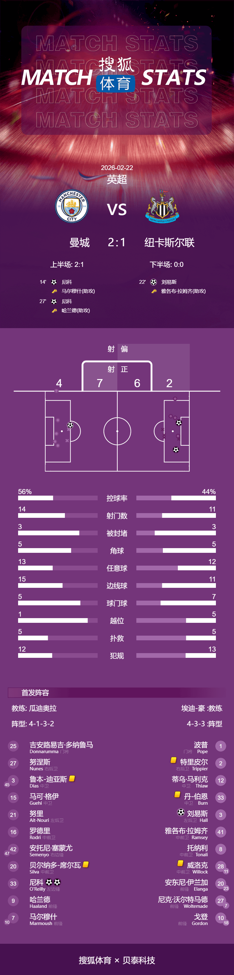 เวลา 04:00 น. ของวันที่ 22 กุมภาพันธ์ 2026 การแข่งขันพรีเมียร์ลีกฤดูกาล 2025-2026 รอบที่ 27 มีการแข่งขันที่น่าจับตามองเมื่อแมนเชสเตอร์ซิตี้เปิดบ้านต้อนรับนิวคาสเซิลยูไนเต็ด ในครึ่งแรก โอ'ไรลีย์ทำประตูแรกจากการช่วยของมาร์มูช ลูกเตะมุมของนิวคาสเซิลถูกเคลียร์ แต่ลูกยิงของลูอิส ฮอลล์ไปโดนนูรีและเปลี่ยนทิศทางเข้าประตูฮาแลนด์ส่งบอลข้ามมาให้โอไรลี่ย์โหม่งเข้าประตู จากนั้นแดน เบิร์นทำประตูด้วยการโหม่ง แต่ถูกตัดสินว่าล้ำหน้า ในครึ่งหลังทั้งสองทีมไม่สามารถทำประตูเพิ่มได้ แมนเชสเตอร์ ซิตี้คว้าชัยชนะในบ้านเหนือนิวคาสเซิล 2-1 ทำให้พวกเขาชนะติดต่อกันในทุกรายการเป็น 5 นัด และลดช่องว่างกับจ่าฝูงพรีเมียร์ลีก อาร์เซนอล เหลือเพียง 2 คะแนน
