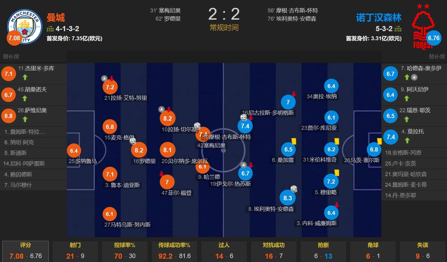 แมนเชสเตอร์ซิตี้ vs น็อตติงแฮมฟอเรสต์กวาร์ดิโอล่ามีรูปแบบ 4132, ฮาร์แลนด์และเซเมนิโอเป็นคู่หน้า, ฟูเดน, บีซี, มิดฟิลด์เชอร์คีย์สามคน, มิดฟิลด์เดี่ยวร็อดลีย์, นูเนส, รูเบนตาย, เกย์, นูรีฟอร์มสี่หลัง, ประตูดอนนารุมมา, เริ่มต้น 735 ล้านยูโร; เปเรร่า (อดีตโค้ชเซี่ยงไฮ้พอร์ต) 532 รูปแบบเริ่มต้นด้วย 3. 3 พันล้านยูโร