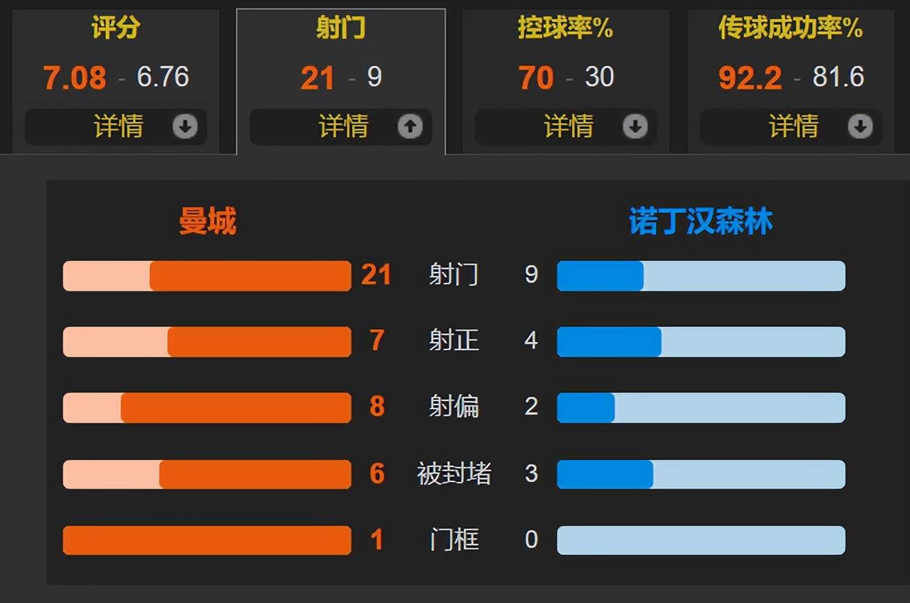 ในเกมทั้งหมด อัตราการครองบอลของแมนเชสเตอร์อยู่ที่ 70% และเขายิงได้ 21 ฟุต โดยมีเพียง 7 นัดเท่านั้นที่เข้าเป้า น็อตติงแฮม ฟอเรสต์ 9 นัด รวม 4 ลูกในเป้าหมาย