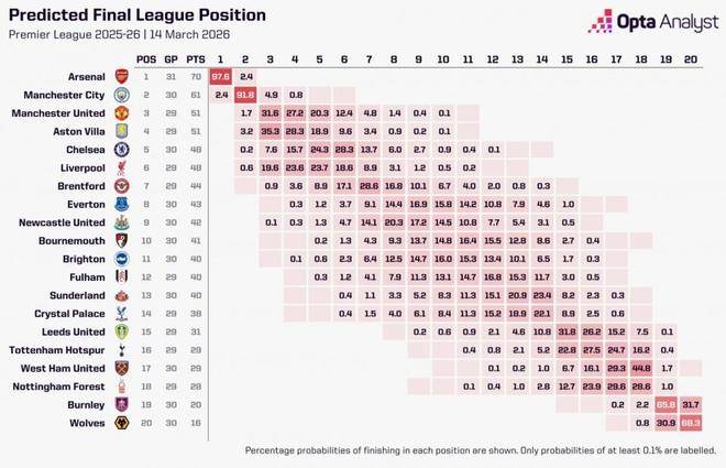 จากการจำลอง 10,000 ของ Opta โดยใช้ซูเปอร์คอมพิวเตอร์ ความน่าจะเป็นที่ Arsenal จะชนะในพรีเมียร์ลีกคือ 97 6% ความน่าจะเป็นของแมนเชสเตอร์ซิตี้ที่จะได้แชมป์คือ 2.4% ส่วนอีก 18 ทีมในพรีเมียร์ลีก ความน่าจะเป็นที่จะคว้าแชมป์ได้ 0%นั้น