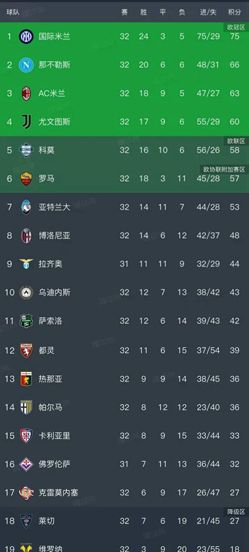 ด้วยชัยชนะ 4-3 ของอินเตอร์ มิลาน เหนือโคโม่ ในวันที่ 13 เมษายน ตามเวลาปักกิ่ง รอบที่ 9 ของเซเรีย อา รอบที่ 32 ได้จบลงไปหมดแล้ว มาดูการเปลี่ยนแปลงล่าสุดกันในอันดับกัน
