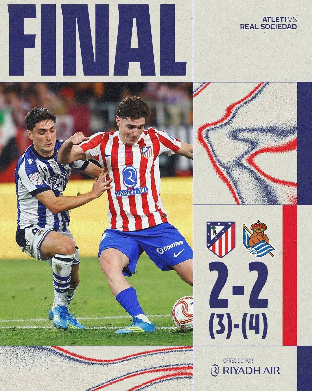 Atletico Madrid แพ้แชมป์ในการยิงลูกโทษใน Copa del Rey รอบชิงชนะเลิศวันเสาร์ และ Real Sociedad ทำแต้มจาก Ander Barrenetxea ในครึ่งแรก และ Luckman ทำคะแนนให้เท่ากัน ในครึ่งแรก มูโซผู้รักษาประตูของแอตเลติโก มาดริด ได้เตะจุดโทษในเขตโทษ และโอยาสวาร์ยิงประตูได้ ในครึ่งหลัง อัลวาเรซทำคะแนนให้เท่ากันอีกครั้ง และทั้งสองฝ่ายก็เข้าสู่การยิงจุดโทษ ในการยิงจุดโทษ อเล็กซานเดอร์ ซอร์ลอธ และอัลวาเรซ จากแอตเลติโก มาดริด ถูกยิง และมูโซก็ช่วยยิงของออสการ์สันได้ แต่เรอัล โซเซียดาดไม่ได้ทำผิดพลาดใดๆ การปรากฏตัวครั้งสุดท้ายของมารินเข้าสู่จิตวิญญาณ Real Sociedad ชนะครั้งที่สองในรอบ 6 ปี และมาดริดยังคงขาดแคลนแชมป์เป็นเวลา 5 ปี