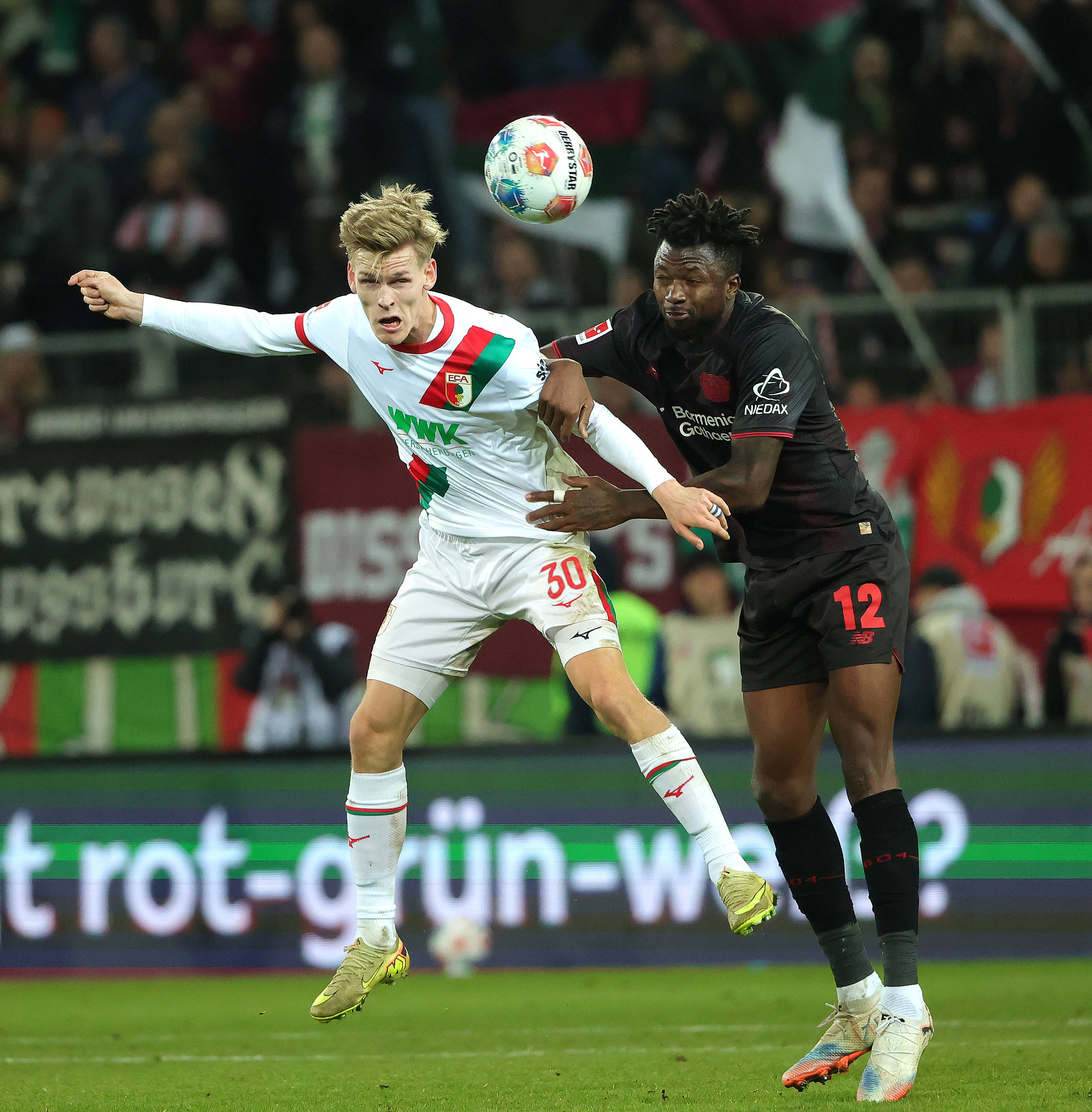 เมื่อวันที่ 6 ธันวาคม เอสเซนเดของเอาก์สบวร์ก (ซ้าย) เข้าปะทะกับอันดริชของไบเออร์ เลเวอร์คูเซ่น เพื่อแย่งบอลระหว่างการแข่งขัน สำนักข่าวซินหัว (ภาพโดย ฟิลิปป์ รุยซ์)