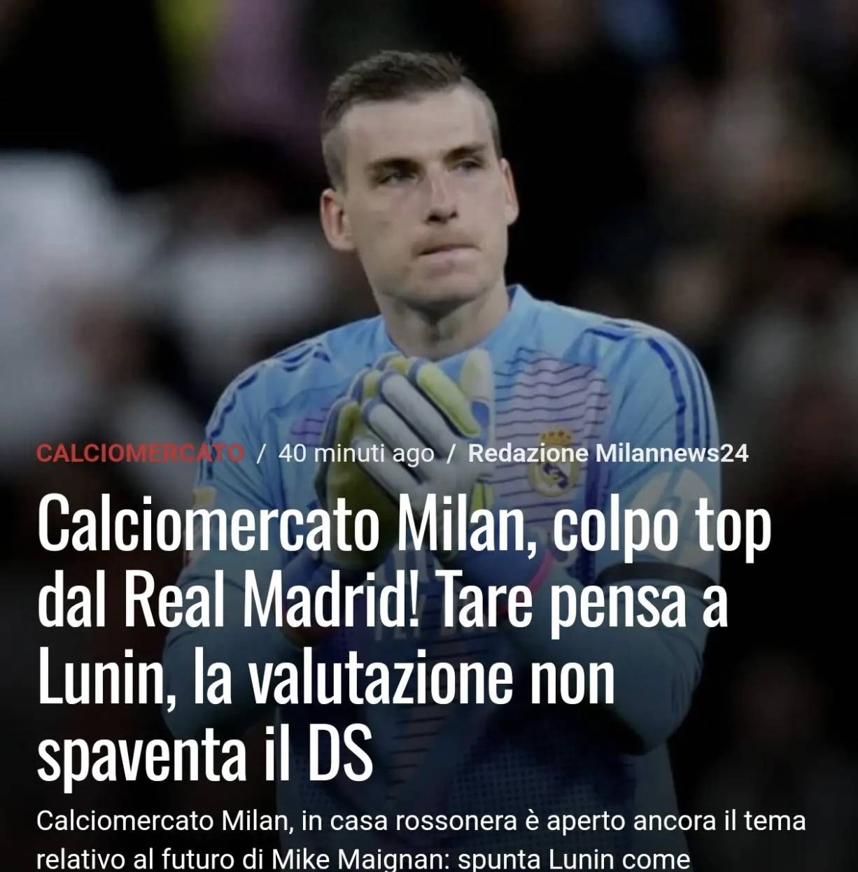 ลู宁ยังคงเป็นเป้าหมายหลัก: สัญญาของเขากับเรอัล มาดริดมีอายุถึงปี 2030 เขาได้รับโอกาสลงสนามน้อยมากในฤดูกาลนี้ และสโมสรได้ประเมินค่าตัวเขาไว้ที่ประมาณ 25 ล้านยูโร มิลานเคยมีข่าวเชื่อมโยงกับลู宁หลังจากการจากไปของดอนนารุมมา แต่ไม่มีการตกลงเกิดขึ้นการย้ายทีมครั้งนี้อาจได้รับแรงผลักดันใหม่ โดยขึ้นอยู่กับการมีส่วนร่วมของเอเยนต์ของนักเตะอย่าง Jorge Mendes ซึ่ง Mendes ยังเป็นตัวแทนของ Pervis Estupiñán อีกด้วย เขามีความสัมพันธ์ในการทำงานที่ดีกับมิลาน และคาดว่าจะช่วยอำนวยความสะดวกในการเจรจาครั้งนี้