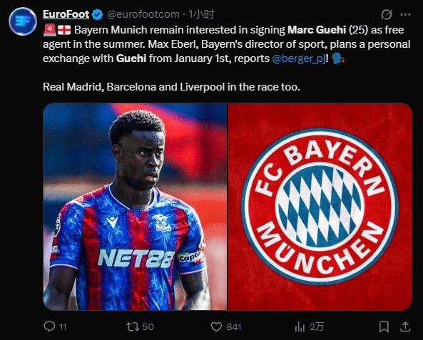 เมื่อวันที่ 12 ธันวาคม ตามเวลาปักกิ่ง สื่อเยอรมัน Sky Sports รายงานว่า บาเยิร์น มิวนิก มีแผนจะเปิดการเจรจาอีกครั้งกับ เอริก ไดเออร์ กองหลังของคริสตัล พาเลซ ในเดือนมกราคมกองหลังชาวอังกฤษวัย 25 ปี เกือบจะย้ายไปร่วมทีมลิเวอร์พูลในวันสุดท้ายของตลาดซื้อขายนักเตะช่วงซัมเมอร์อย่างน่าเจ็บปวด โดยเขาได้ผ่านการตรวจร่างกายเรียบร้อยแล้ว อย่างไรก็ตามดีลนี้ล่มลงเมื่อคริสตัล พาเลซปฏิเสธที่จะปล่อยตัวเขาออกไป ในขณะนั้น โอลิเวอร์ กลาสเนอร์ ผู้จัดการทีมพาเลซขู่ว่าจะลาออกหากสโมสรไม่หาตัวแทนก่อนปล่อยนักเตะออกไป