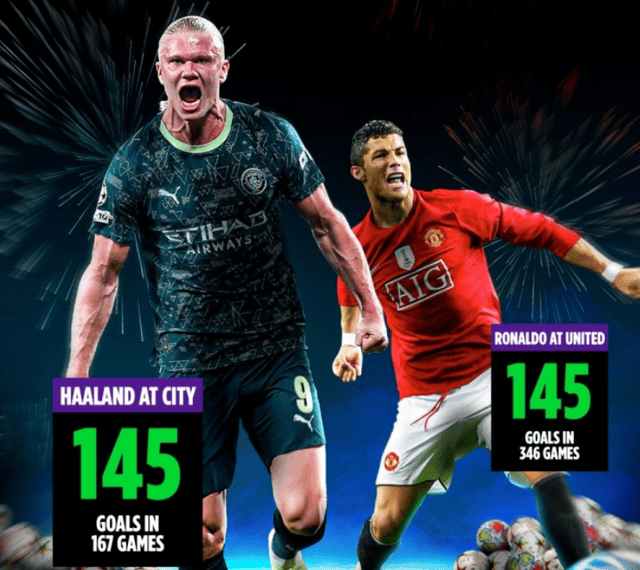 ตามสถิติของ beIN Sport เออร์ลิง ฮาแลนด์ ได้ทำประตูในพรีเมียร์ลีกเท่ากับคริสเตียโน โรนัลโดในช่วงเวลาที่เขาอยู่กับแมนเชสเตอร์ ยูไนเต็ดแล้ว โดยทำสถิตินี้ได้ในจำนวนนัดที่น้อยกว่าครึ่ง! โดยเฉพาะอย่างยิ่ง โรนัลโดต้องลงเล่น 346 นัดเพื่อทำประตูในพรีเมียร์ลีก 145 ประตู ในขณะที่ฮาแลนด์ทำได้เท่ากันในเพียง 167 นัดเท่านั้นนอกจากนี้ ในแง่ของเป้าหมายในอาชีพ ฮาแลนด์ปัจจุบันทำได้ 358 ประตู – 303 ประตูให้กับสโมสรและ 55 ประตูให้กับประเทศ แม้ว่าตัวเลขนี้จะดูเหมือนตามหลังโรนัลโด้เกือบ 600 ประตู แต่จุดสำคัญคือฮาแลนด์อายุเพียง 25 ปี ในขณะที่โรนัลโด้อายุ 40 ปี กองหน้าชาวนอร์เวย์เล่นน้อยกว่าโรนัลโด้ถึง 15 ฤดูกาลที่น่าสังเกตยิ่งกว่านั้น ฮาแลนด์นำในการจัดอันดับตลอดกาลในอีกสามหมวดหมู่การทำประตู: เขาเป็นผู้เล่นที่เร็วที่สุดที่ทำประตูในพรีเมียร์ลีกครบ 100 ประตูใน 111 นัด, ถือสถิติการทำประตูสูงสุดต่อสโมสรที่หนึ่งประตูทุกๆ 54 นาที, และทำประตูในระดับนานาชาติได้ 51 ประตูใน 46 นัด – ซึ่งเป็นสถิติการทำ 50 ประตูที่เร็วที่สุดในประวัติศาสตร์