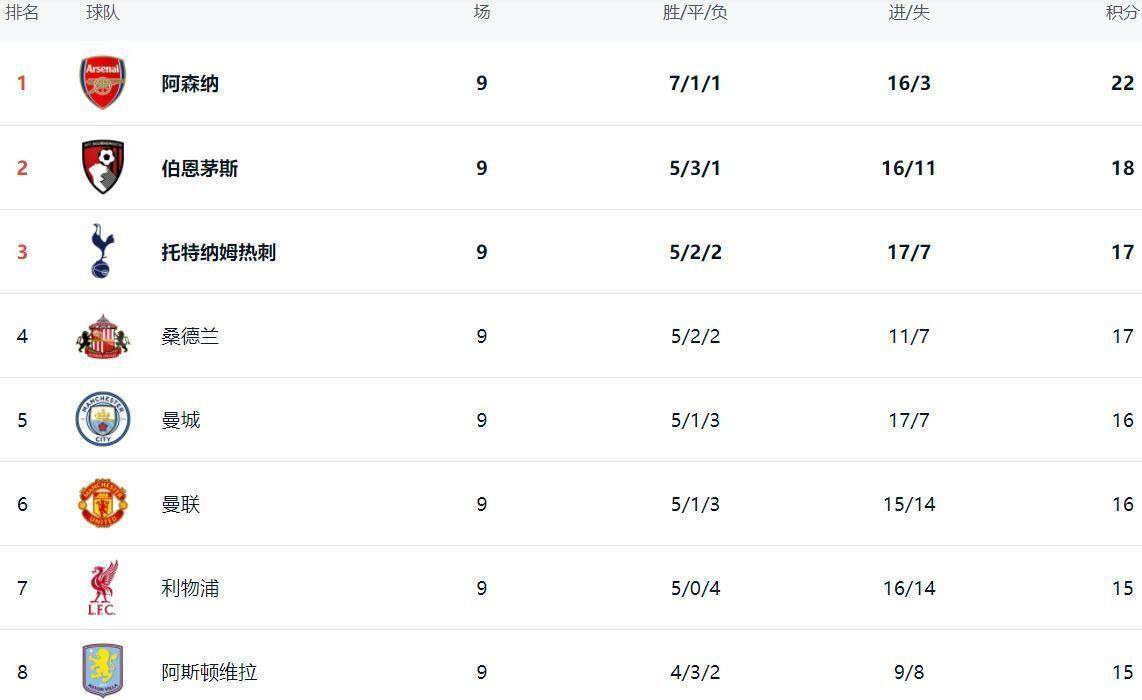 ตารางลีกตอนนี้แสดงให้เห็นภาพที่วุ่นวายอย่างสิ้นเชิง อาร์เซนอลครองตำแหน่งจ่าฝูงด้วย 22 คะแนนจากชัยชนะ 7 นัด เสมอ 1 นัด และแพ้ 1 นัด นำโด่งเป็นจ่าฝูง การชนะคริสตัล พาเลซ 1-0 ในรอบนี้ไม่ได้สวยงามนัก แต่มีประสิทธิภาพอย่างเต็มที่ โดยเอเซทำประตูเดียวในเกมนี้ ขณะที่แนวรับยังคงแข็งแกร่งเหมือนหินผา