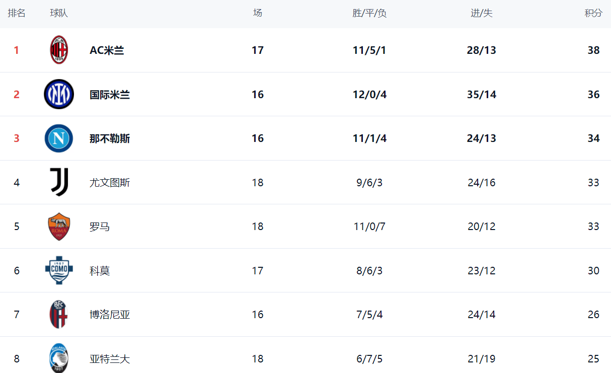 ในตารางลีก เอซี มิลาน นำเป็นจ่าฝูงด้วย 38 คะแนน อินเตอร์ มิลาน ตามมาติดๆ ด้วย 36 คะแนน ห่างเพียงสองคะแนนเท่านั้น นอกจากนี้ อินเตอร์ยังมีเกมในมือมากกว่าเอซี มิลานหนึ่งนัด และมีโอกาสที่จะกลับขึ้นไปครองตำแหน่งจ่าฝูงในการแข่งขันนัดต่อไป นาโปลี อยู่ในอันดับสามด้วย 34 คะแนน ช่องว่างระหว่างสามอันดับแรกยังคงแคบยูเวนตุสเก็บได้เพียงหนึ่งแต้ม ทำให้พวกเขามี 33 คะแนน อยู่ในอันดับที่สี่ โรม่าที่พ่ายแพ้ยังคงมี 33 คะแนน อยู่ในอันดับที่ห้า โคโมอยู่ในอันดับที่หกด้วย 30 คะแนน โบโลญญ่าอยู่ในอันดับที่เจ็ดด้วย 26 คะแนน อตาลันต้าได้เลื่อนขึ้นมาอยู่ในอันดับที่แปด โดยมี 25 คะแนน