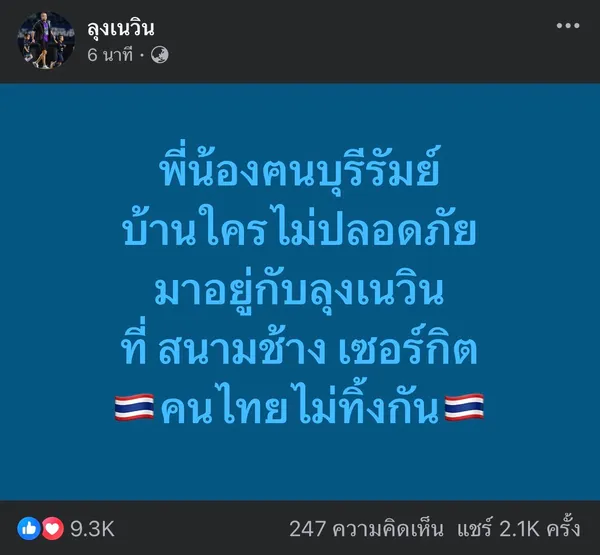 "พี่น้องฅนบุรีรัมย์ บ้านใครไม่ปลอดภัย มาอยู่กับลุงเนวิน ที่ สนามช้าง เซอร์กิต คนไทยไม่ทิ้งกัน"