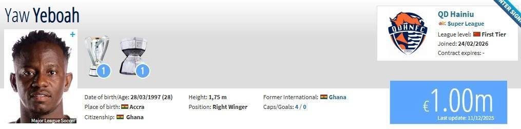 ประกาศอย่างเป็นทางการ! นักเตะทีมชาติกานาวัย 28 ปี เข้าร่วมวงการฟุตบอลซานตง อดีตนักเตะของแมนเชสเตอร์ ซิตี้ ทีมยักษ์ใหญ่ในพรีเมียร์ลีก_ชิงเต่า เฮงต้า_ฤดูกาล
